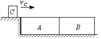 2、两块厚度相同的木块A和B,紧靠着放在光滑的水平面上,其质量分别为 , ,它们的下底面光滑,上表面粗糙;另有一质量 的滑块C(可视为质点),以 的速度恰好水平地滑到A的上表面,如图所示,由于摩擦,滑块最后停在木块B上,B和C的共同速度为3.0m/s,求: (1)木块A的最终速度 ; (2)滑块C离开A时的速度 。